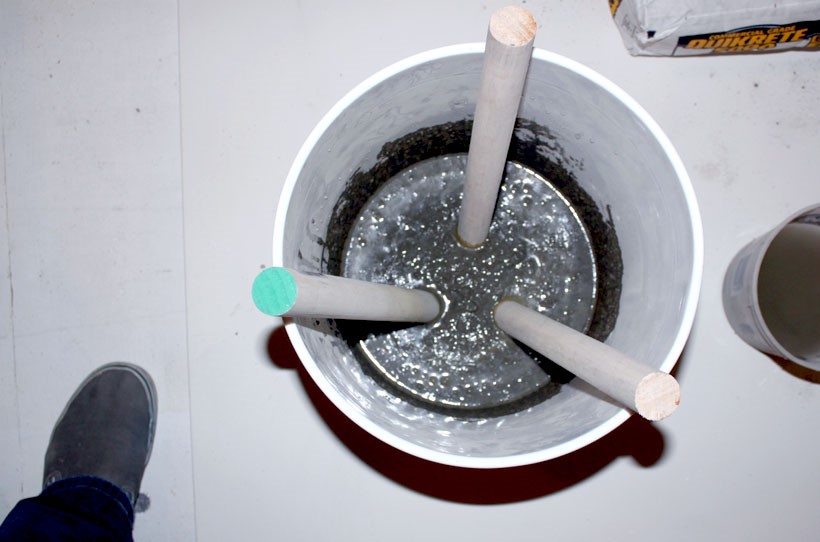 ცემენტი წყალში გააზავეთ, შემდეგ ცემენტიან სათლში მოათავსეთ ხის მასალა ისე, რომ მათ სამკუთხედი შექმნან. დატოვოთ ღამე და როცა გაშრება ამოიღეთ.