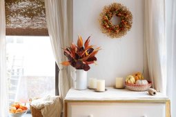 მოძებნეთ ძველი ლარნაკი, ძველი სარკე ან თუნდაც უკვე მოძველებული გადასაფარებელი, მოაწყვეთ ეს ყველაფერი ერთ კუთხეში და სახლში შემოდგომის განწყობა აუცილებლად შეიქმნება.